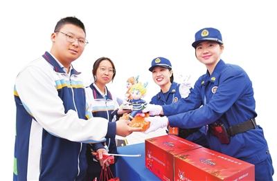 學生領取“消防螭吻”“救援螭吻”卡通紀念品。