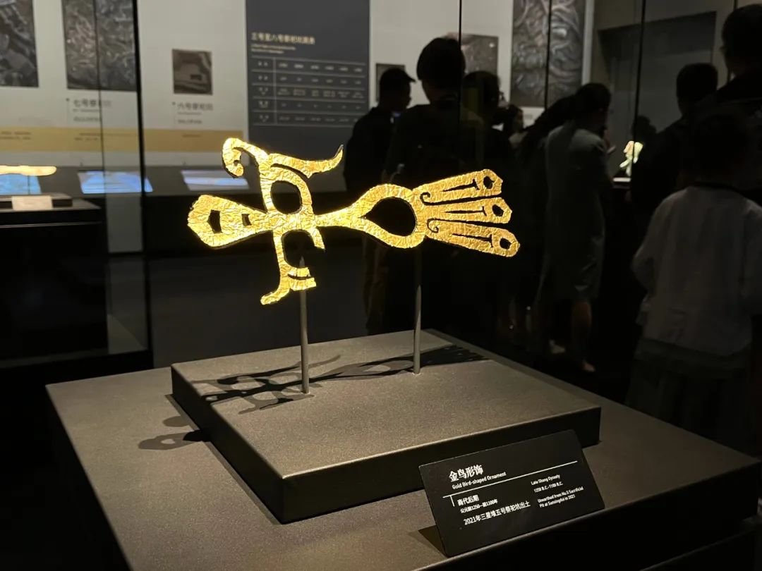 三星堆遺址三期文化遺存距今約3300年-3100年(約當商代后期),重要遺跡有倉包包城墻、青關山等地點大型建筑遺跡和三星堆地點祭遺存。主要遺物有青銅器、金器、玉器和陶器等類,其中,青銅器有尊、罍、大立人像、神樹、人頭像、面具、神壇等,金器有面具、金杖等,玉器有璋、戈、璧、琮等,陶器有三足炊器、高領甕、觚形器、高柄豆、厚唇侈口缸、矮領甕、鳥頭柄器、盉、平底罐等。