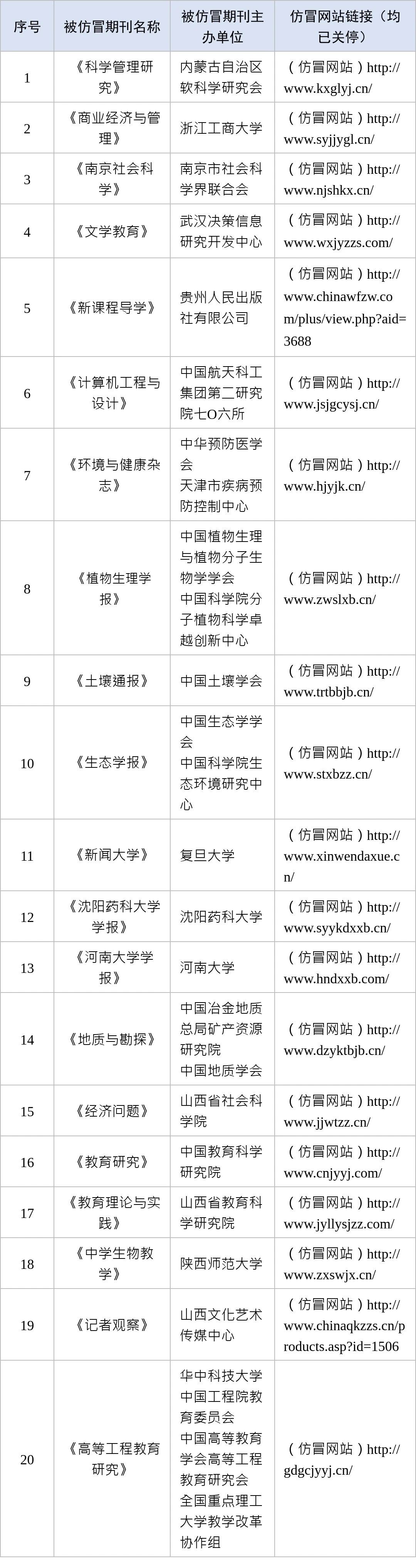 近日,中央網信辦舉報中心根據網民舉報線索,會同相關部門依法受理處置一批仿冒學術期刊詐騙網站。這些仿冒網站頁面與國內一些高等院校、科研院所等主管主辦的學術期刊網站頁面內容相似性很高,并冒用其名義對外發布約稿通知,誘騙作者投稿,借機收取所謂“審稿費”“版面費”斂財牟利,嚴重侵害網民合法權益,擾亂正常學術論文出版秩序。現公布一批仿冒詐騙網站名單,請廣大網民提高警惕,注意辨別,避免上當受騙。