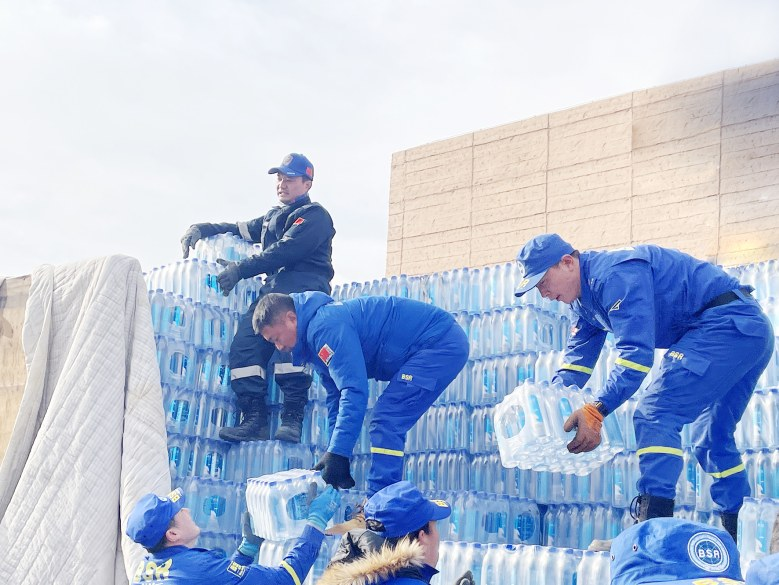 12月21日上午,長(zhǎng)治藍(lán)天救援隊(duì)4車(chē)13人以及拉載有愛(ài)心企業(yè)捐贈(zèng)棉大衣500件、棉衣棉褲100套、棉床墊85套的貨車(chē)司機(jī)2人,到達(dá)甘肅省積石山大河家清真大寺(甘肅藍(lán)天救援前指)報(bào)到。顧不上休息,日夜連續(xù)趕路近20個(gè)小時(shí)的隊(duì)員們馬上開(kāi)始搬運(yùn)物資、為當(dāng)?shù)厥転?zāi)群眾搭建臨時(shí)帳篷。
