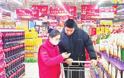 博源超市店長栗強介紹,市民可以線上下單線下進行配送,尤其是采辦年貨時,量比較多,超市可直接為市民配送到家,在線上也可以享受到我們的優惠打折活動,讓市民足不出戶備足年貨。