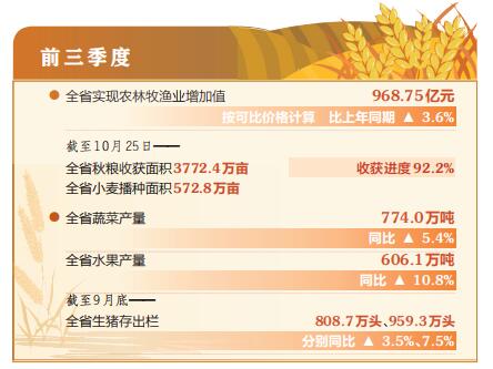 畜牧業增長較快。我省全力穩定生豬產能,大力發展牛羊草食畜牧業,支持495個畜禽養殖場標準化升級改造,重點抓好5個生豬、7個肉牛、2個奶牛、2個肉羊大縣建設。截至9月底,全省生豬存出欄808.7萬頭、959.3萬頭,分別同比增長3.5%、7.5%。肉、蛋、奶產量分別為123.1萬噸、94.5萬噸、108.6萬噸,同比分別增長8.1%、6.3%、4.8%。