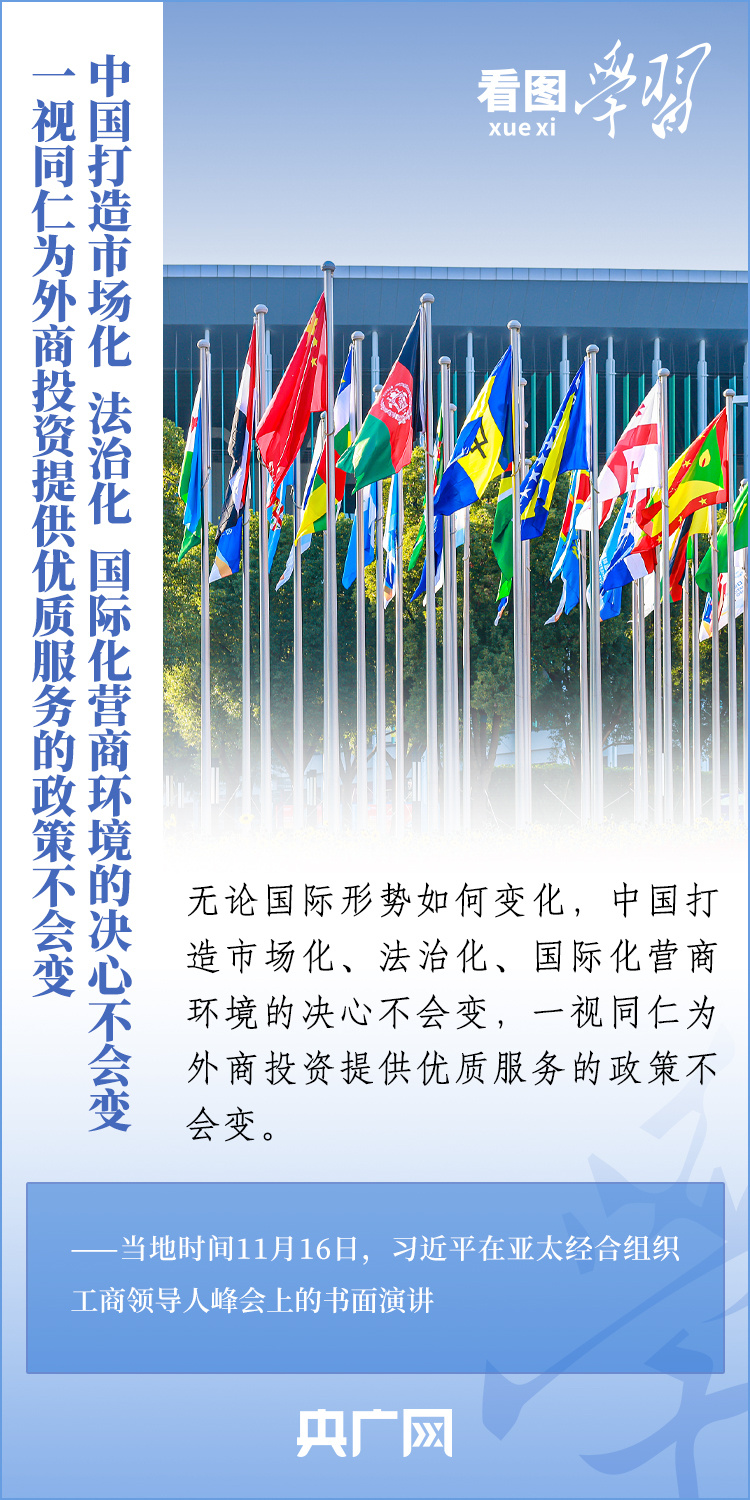 當地時間11月16日,國家主席習近平應邀出席亞太經合組織工商領導人峰會并發表書面演講。習主席深刻總結了亞太經濟合作30年來非凡成就和啟示,對亞太合作下一個30年將走向何方這一新的時代之問提出中國答案,重申“中國打造市場化、法治化、國際化營商環境的決心不會變,一視同仁為外商投資提供優質服務的政策不會變”,向全球工商界發出邀請,歡迎“積極參與中國式現代化進程,共享中國高質量發展帶來的巨大機遇!”一起來學習。
