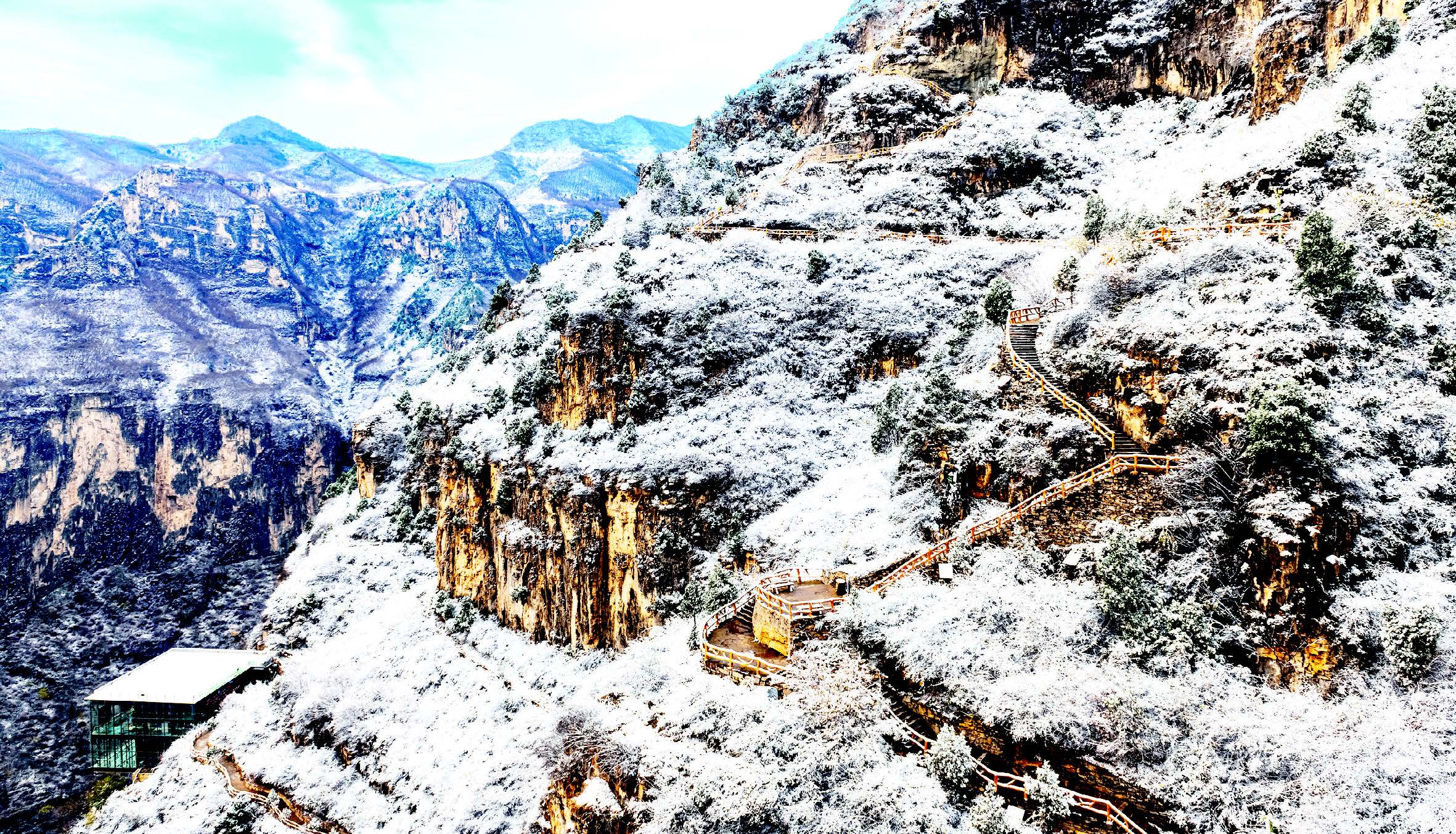 2月20日,我市迎來降雪天氣,太行山猶如披上了銀裝,林木間、枝頭上凝霜掛雪,連綿起伏的山巒和皚皚白雪相輝映,宛如一幅清新淡雅的水墨畫卷,盡顯北國風光。圖為壺關縣八泉峽景區雪景。