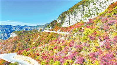 時值金秋,平順縣虹梯關(guān)鄉(xiāng)太行天路一帶的太行山脈秋意正濃。登高遠望,層層山巒連綿起伏,一叢叢、一片片,紅的似火、黃的似金、綠的似玉,各種顏色點綴在山間、路旁,五彩斑斕,美不勝收,宛如一幅濃墨重彩的壯美畫卷。