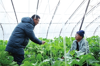 農技人員在大棚中指導種植戶做好防寒措施。