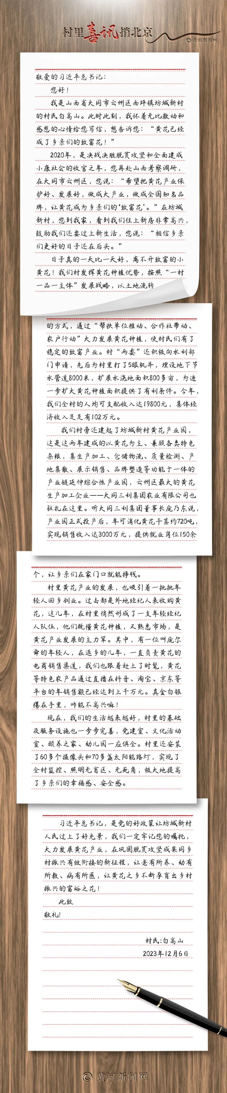 編者按:為深入學習宣傳貫徹黨的二十大精神和習近平總書記考察調(diào)研山西重要講話重要指示精神,黃河新聞網(wǎng)策劃《村里喜訊捎北京——紙短情長話振興》專題報道,深入習近平總書記曾到訪過的鄉(xiāng)村、平遙古城、運城鹽湖等地開展蹲點式采訪,聚焦老鄉(xiāng)“新生活”“新農(nóng)活”“新觀念”,充分展現(xiàn)基層干部群眾砥礪奮進的精神風貌,共創(chuàng)美好新生活的生動圖景,最終形成“家書”,將“喜訊捎北京”。第二期《給總書記的一封信:“黃花已經(jīng)成了鄉(xiāng)親們的致富花!”》全文如下: